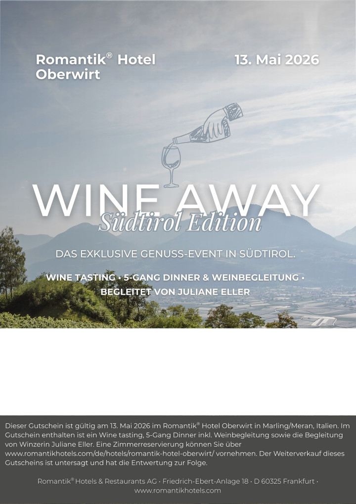 Erleben Sie einen besonderen Tag voller Wein, Kulinarik und inspirierender Begegnungen in der einzigartigen Landschaft Südtirols. Gemeinsam mit Winzerin Juliane Eller von JUWEL Weinen aus Alsheim laden wir Sie zu einem exklusiven Genuss-Erlebnis im Romantik® Hotel Oberwirt nach Meran ein.